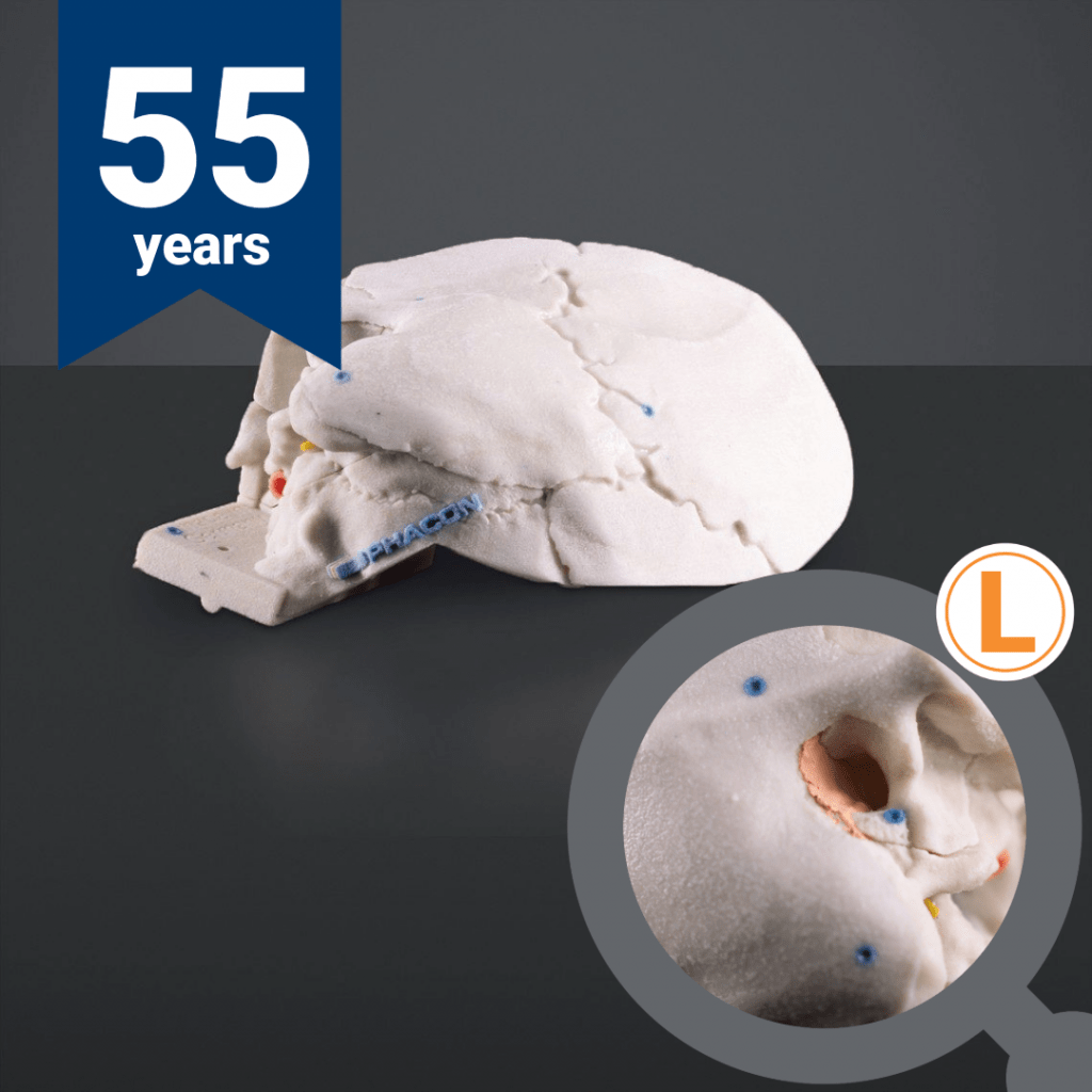 The PHACON Temporal Bone Patients are artificial 3D-models to practice different surgeries on the temporal bone, for instance a cochleostomy. They are compatible with the PHACON Temporal Bone Trainer and PHACON Temporal Bone Assistant equipment sets. All PHACON artificial 3D-models are based on real patient CT-data, reflecting the most diverse human tissue properties (bones, cartilage, muscles, skin and nerves), handcrafted to the smallest detail using a variety of materials. Other compatible PHACON Temporal Bone Patients can be reordered at PHACON any time.